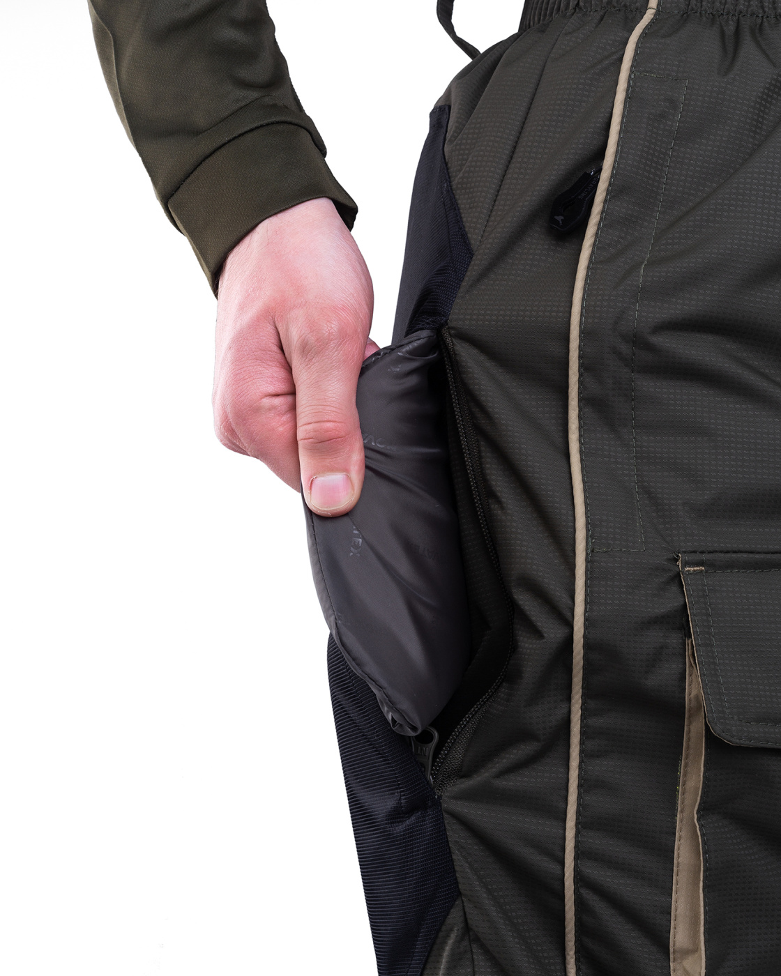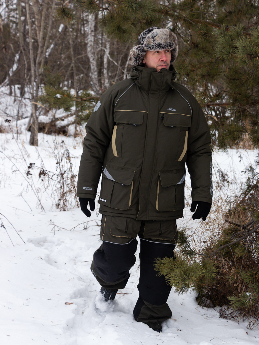 Костюм «Камчатка» для зимней рыбной ловли. Мембранная ткань не продувается и не промокает. Отделка укрепляет износостойкие места (локти, зона сидения, колени).