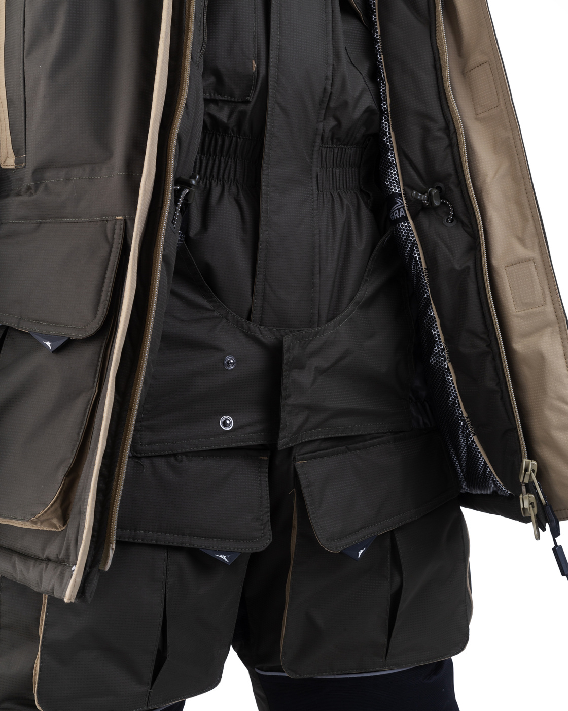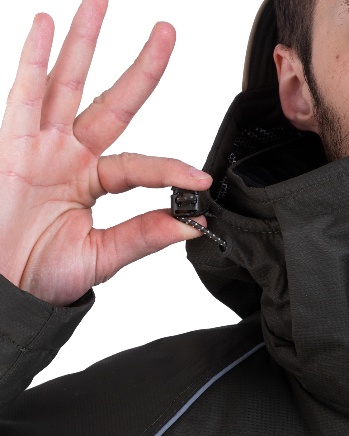 Куртки с большим количеством вместительных карманов и прочным капюшоном с козырьком. Низ рукавов на липучке. Брюки на регулируемых лямках, по низу утянуты резинками.