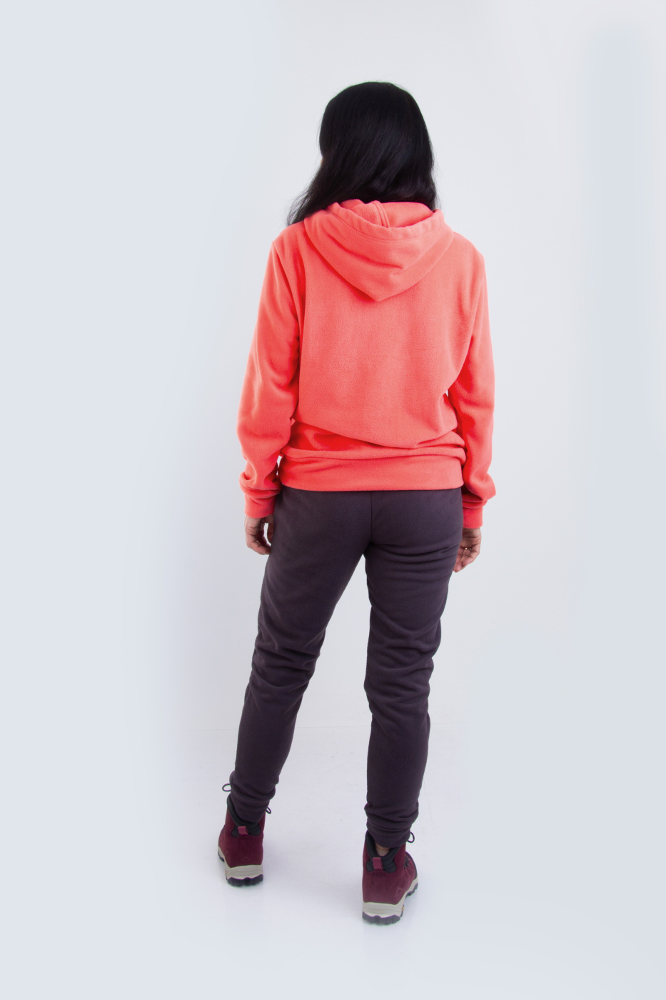 Костюм состоит из толстовки с капюшоном и брюк-джогеров, изготовленных из двухстороннего флиса плотностью 300 г/м², который обеспечивает невероятную мягкость и тепло. Толстовка выполнена в оверсайз-стиле, что добавляет ей непринужденности и стиля. Удобный карман кенгуру позволяет носить с собой мелкие вещи или просто согреть руки, а капюшон с регулировкой по лицевому краю на плоский шнур обеспечивает защиту от ветра и холода.