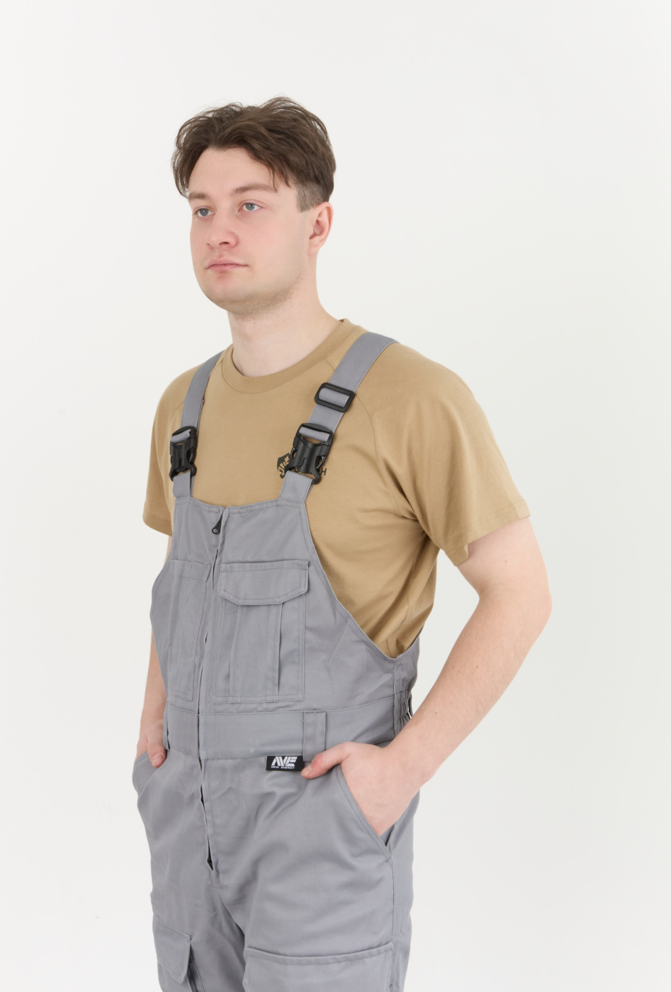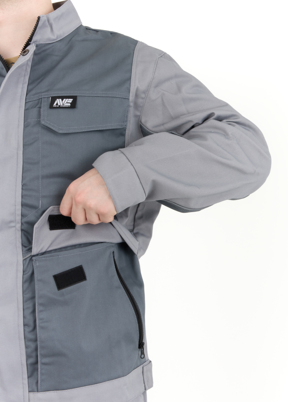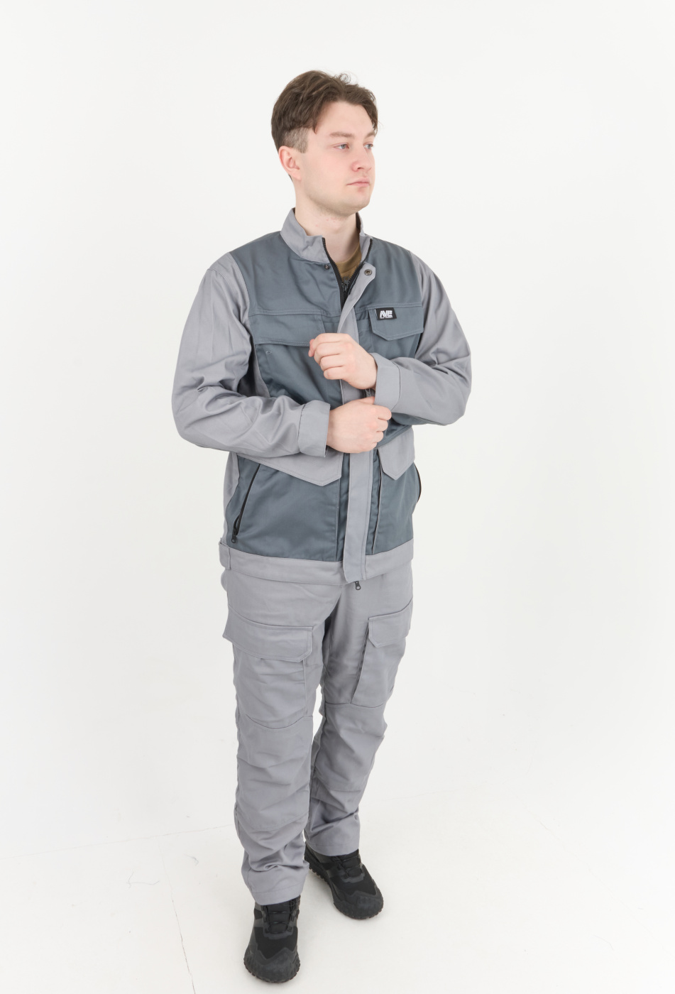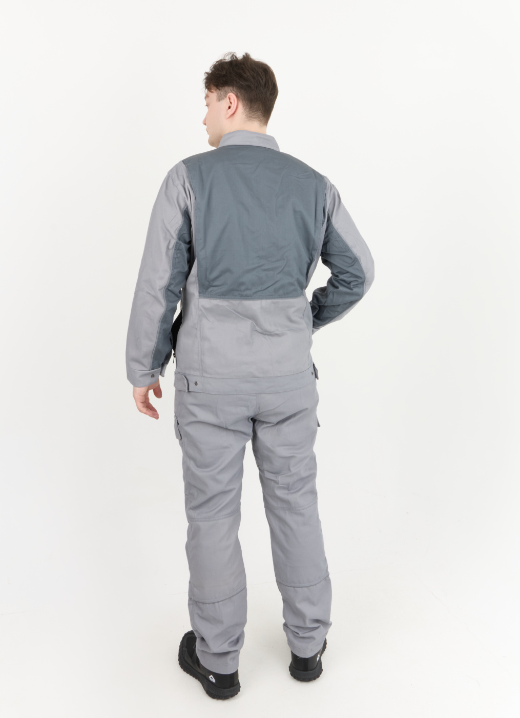 Рабочий комплект выполнен в сером цвете, что позволяет его легко сочетать с другими элементами рабочей одежды